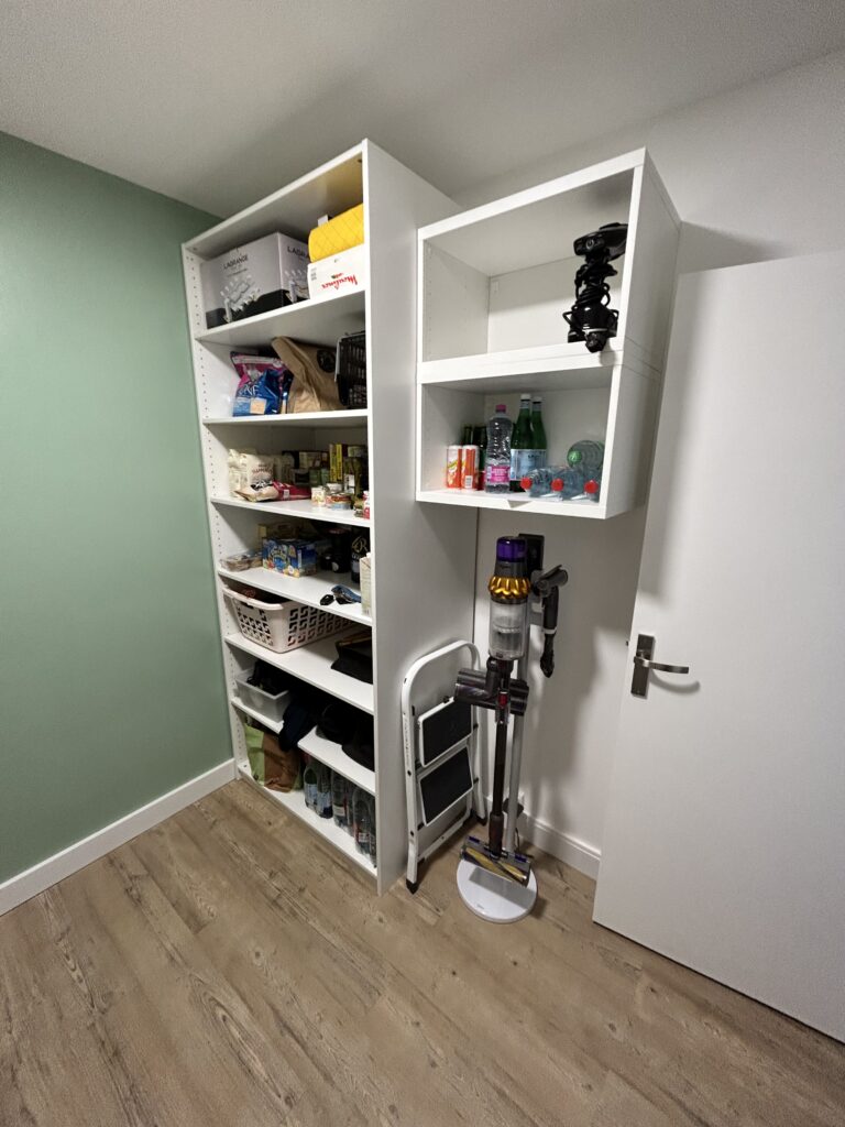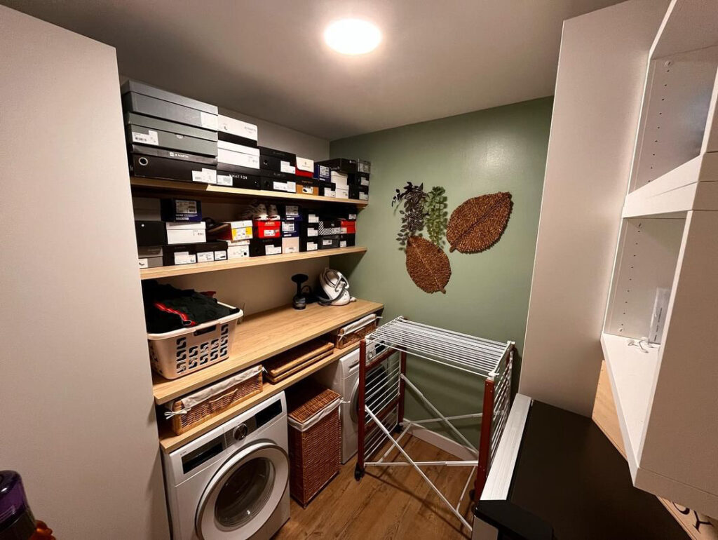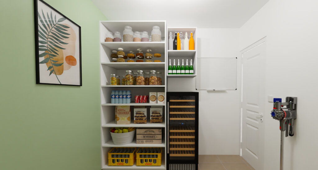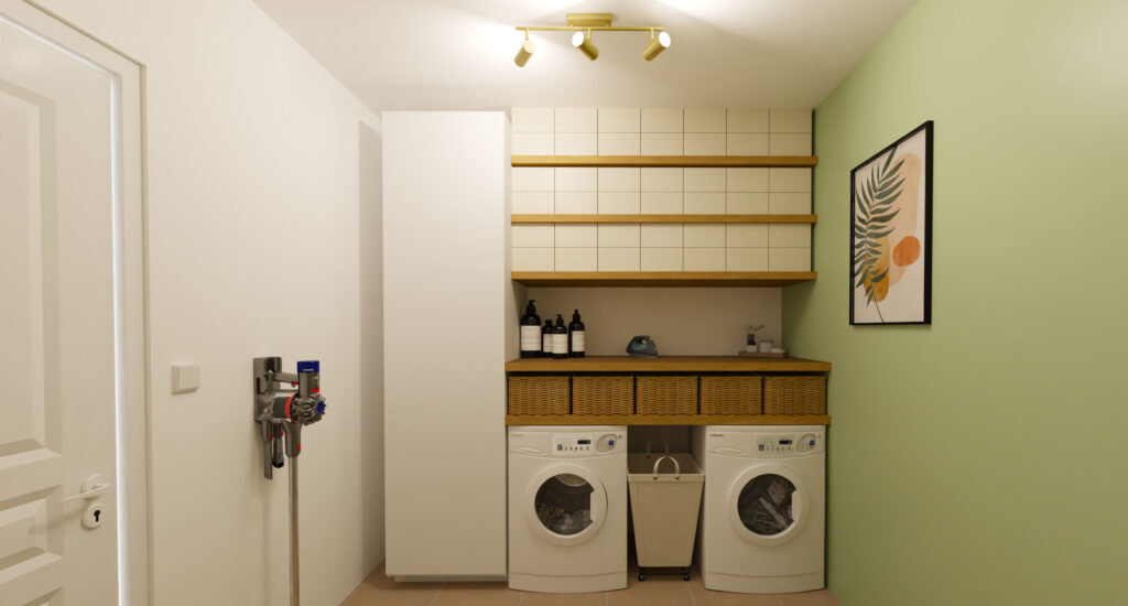 Enfin, pour la dernière pièce, la cliente voulait aménager à la fois une buanderie et un cellier. Dans la buanderie, elle désirait des espaces de rangement bien organisés, incluant un plan de travail pour le pliage du linge et le repassage, tandis que le cellier devait offrir des rangements ouverts pour une visualisation facile, avec une esthétique bois-blanc-vert, sans oublier l’intégration de la cave à vins.