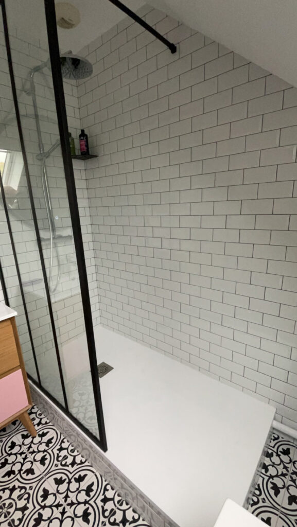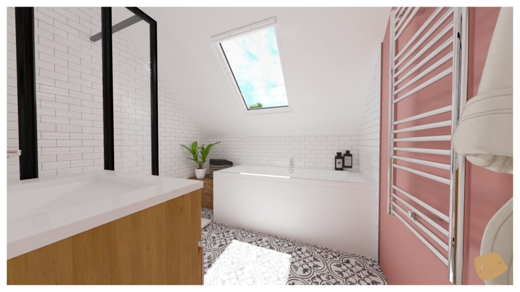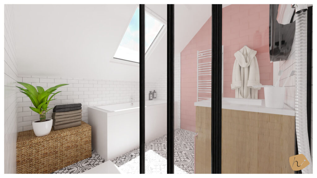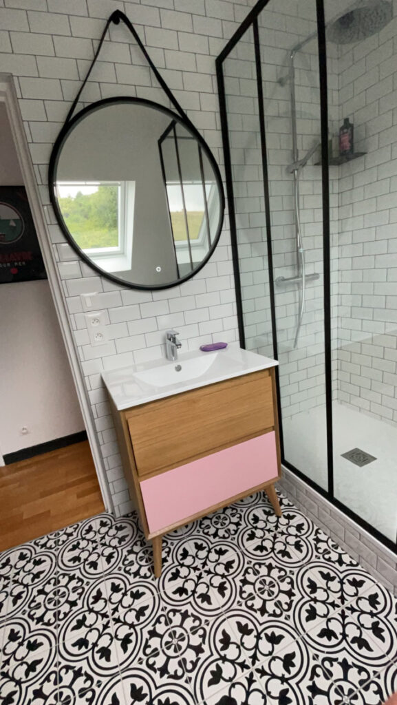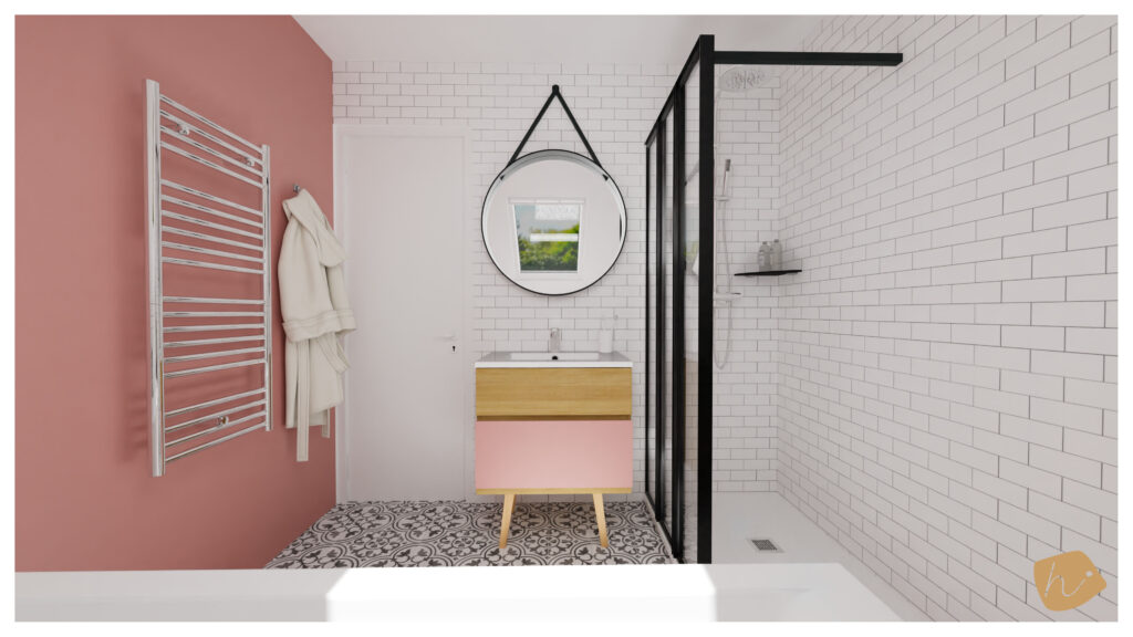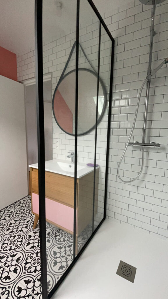 Pour la salle de bain, elle souhaitait une ambiance scandinave, caractérisée par une couleur vive, le rose, et l’utilisation de matériaux naturels tels que la pierre et le bois, avec une touche parisienne grâce au carrelage métro rappelant celui utilisé dans le métro parisien. Le tout est rehaussé par une touche de noir.