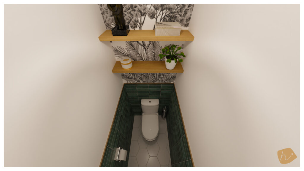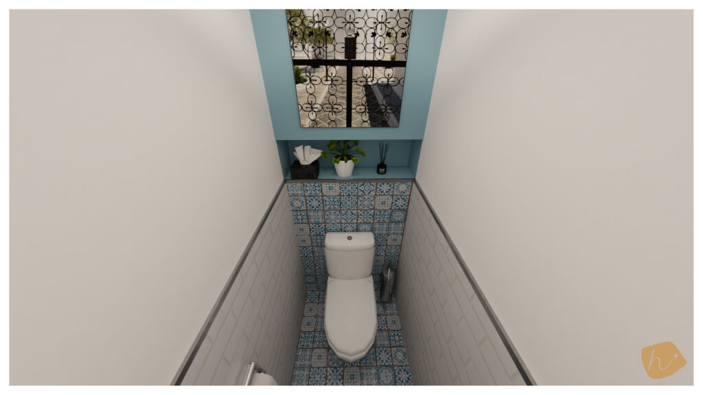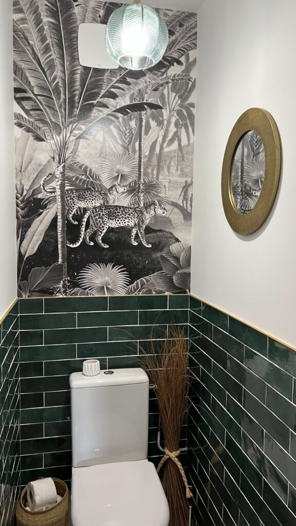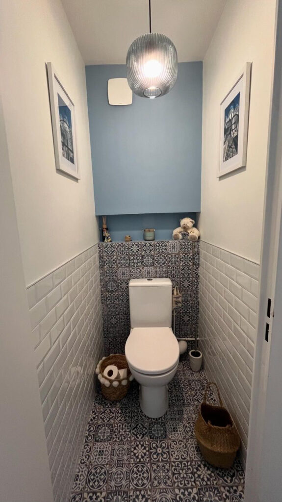 Pour les deux toilettes de sa maison, elle souhaitait rénover leur décoration. Le premier devait rappeler l’ambiance de Santorin, avec des carreaux de ciment bleus et blancs, tandis que le second devait refléter un style plus naturel, évoquant une atmosphère Jungle Life avec l’utilisation de bois et de vert foncé.